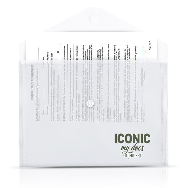 Pasta A4 em 600D com bolso exterior frontal. A pasta contém 4 argolas de 20mm no interior, que permitem anexar folhas A4